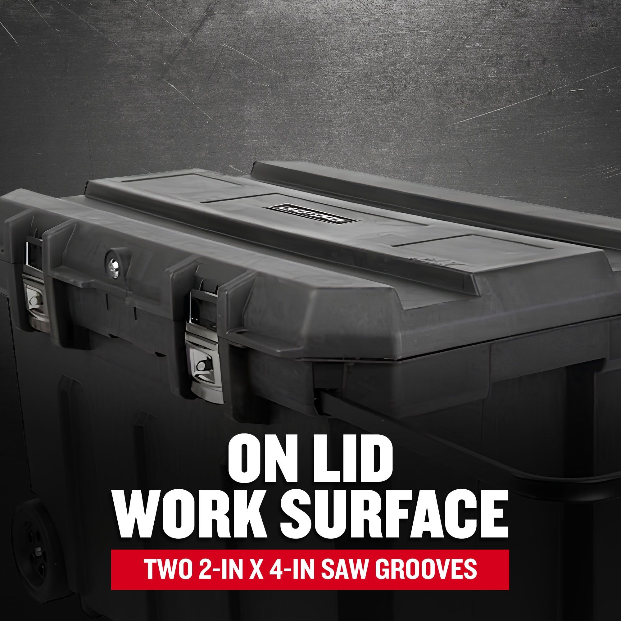 - On lid work surface: wide work surface on lid that includes two 2-in x 4-in saw grooves