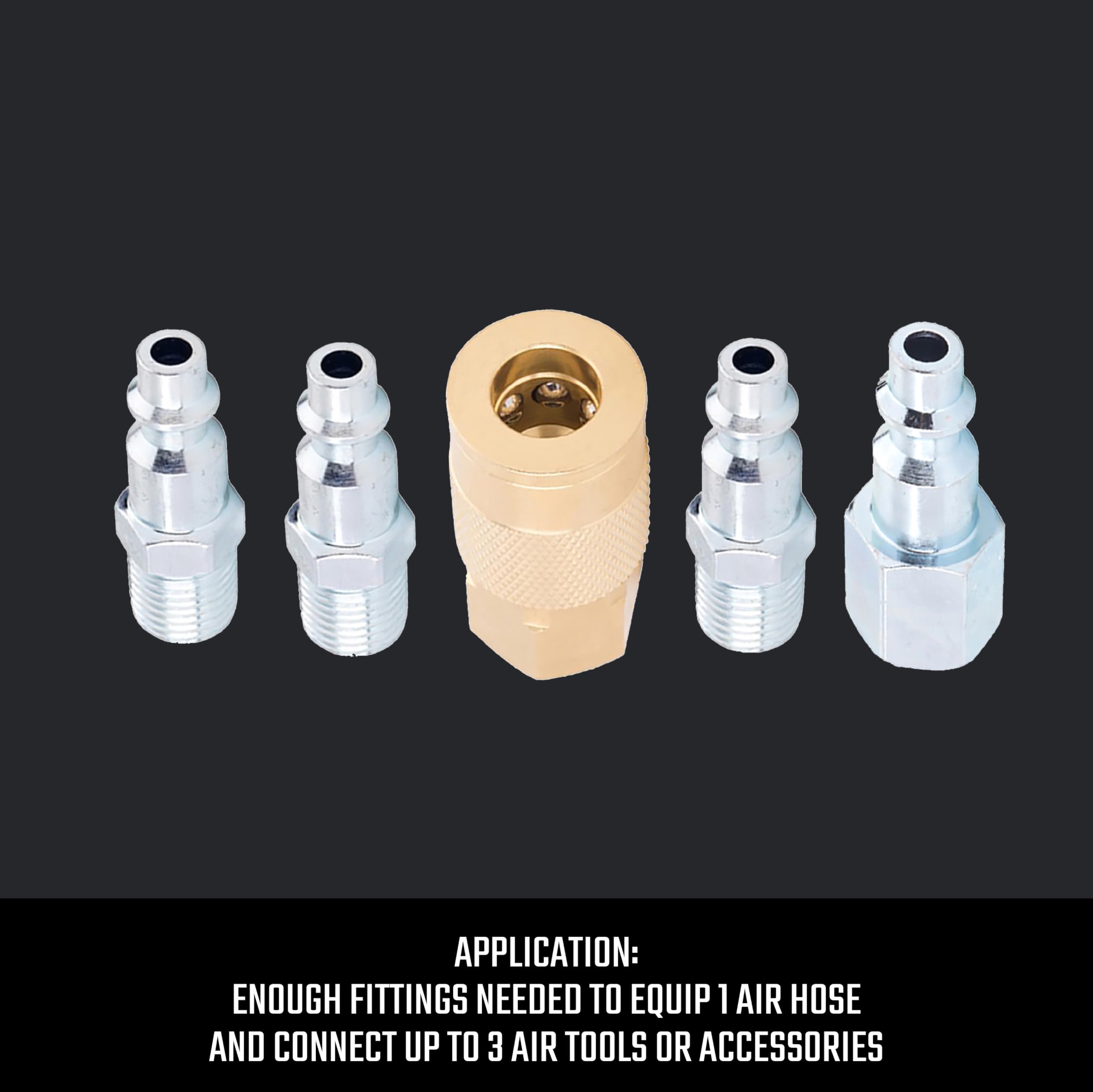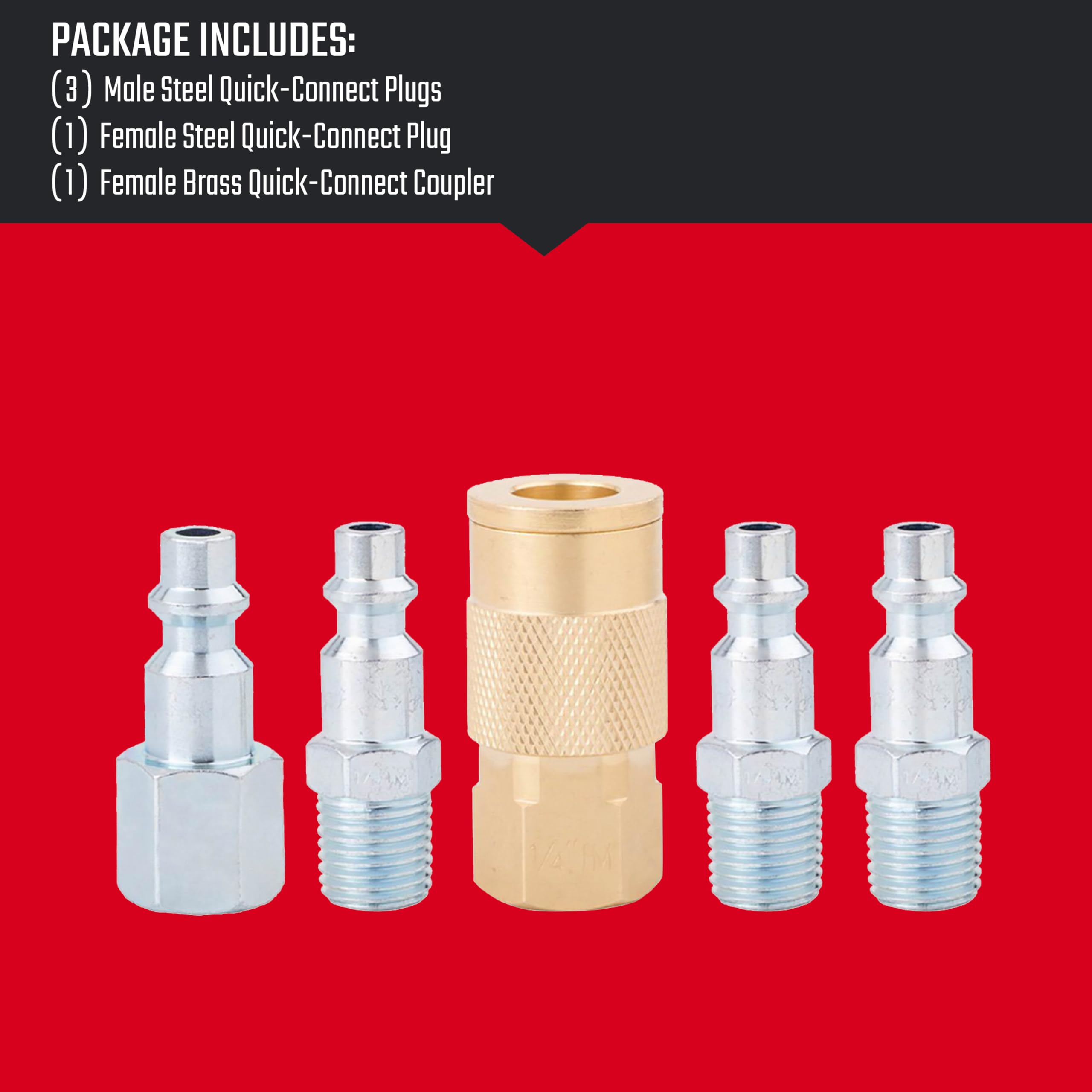- 5-Piece set includes 3 male steel quick-connect plugs, 1 female steel quick-connect plug, and 1 female brass quick-connect coupler