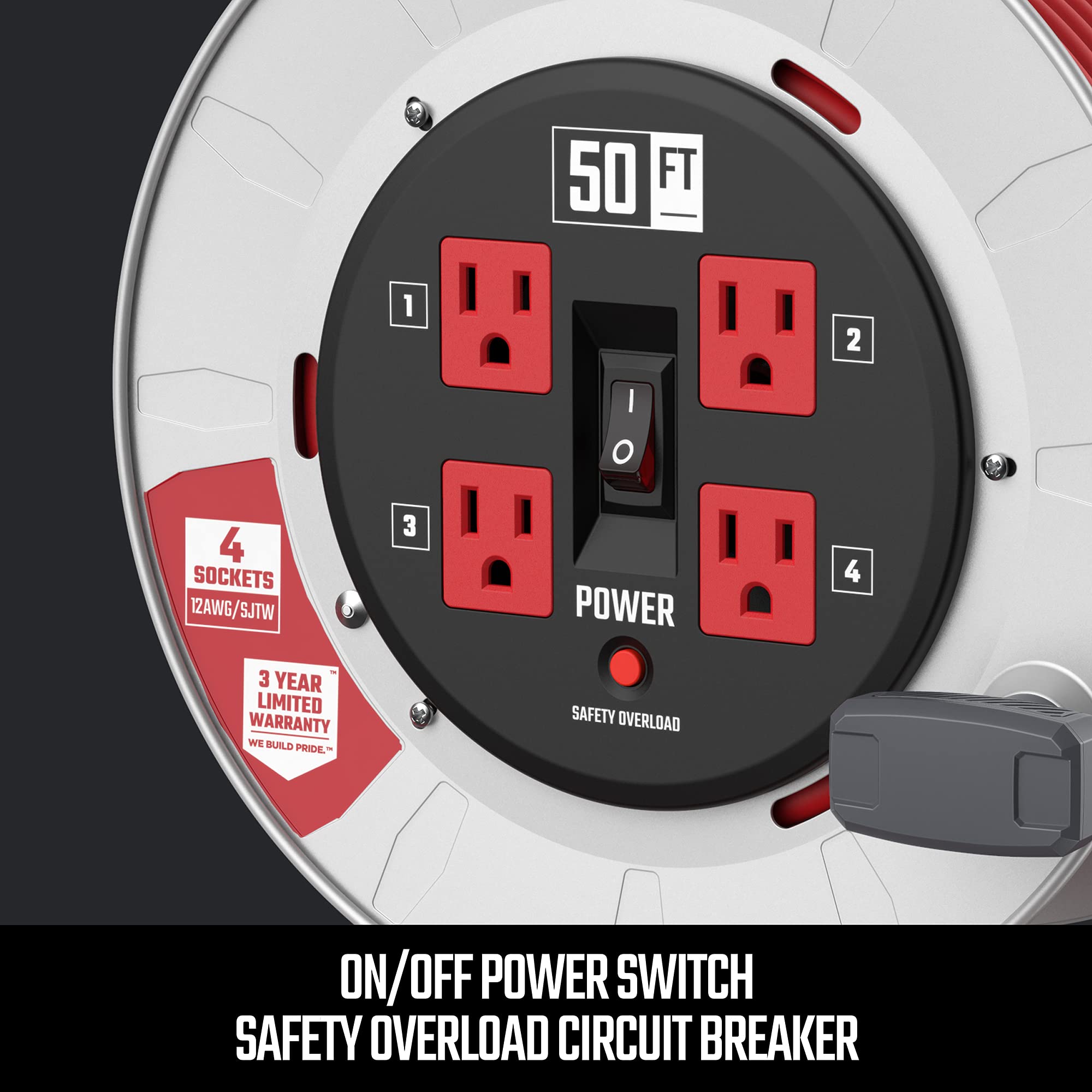 - Convenient 4 Outlet Extension Cord: Always have outlets where you need them with this outside retractable power cord reel! This roll-up extension cord includes 4 grounded outlets and a durable 12AWG cord which comes in a high visibility color, ensuring safe practice in whatever environment the reel extension cord is used.