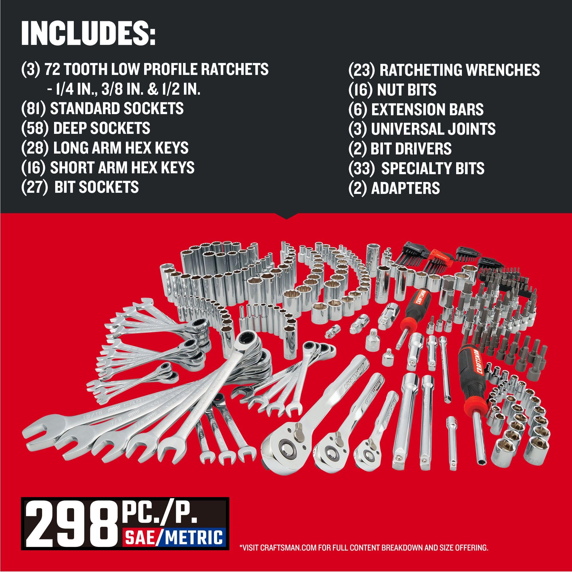 CRAFTSMAN Mechanics Tool Set, 298 Piece Hand Tool and Socket Set SAE/Metric (CMMT12139)