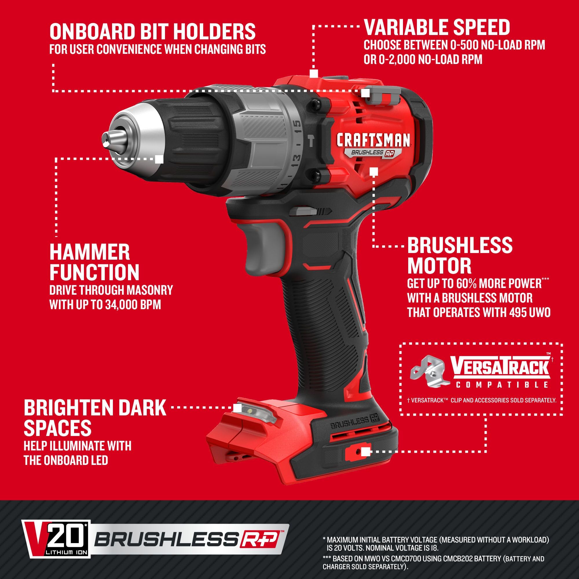 CRAFTSMAN V20 1/2 Inch Cordless Hammer Drill, Bare Tool Only (CMCD726B)